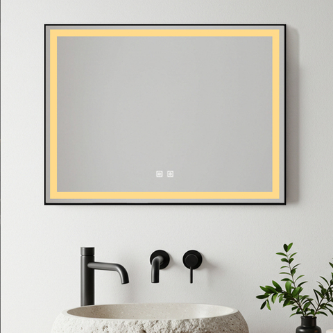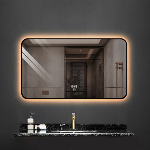 Espejo de baño antivaho rectangular moderno al por mayor, luz LED IP44, marco negro, Interruptor táctil para hoteles, apartamentos/villas inteligentes